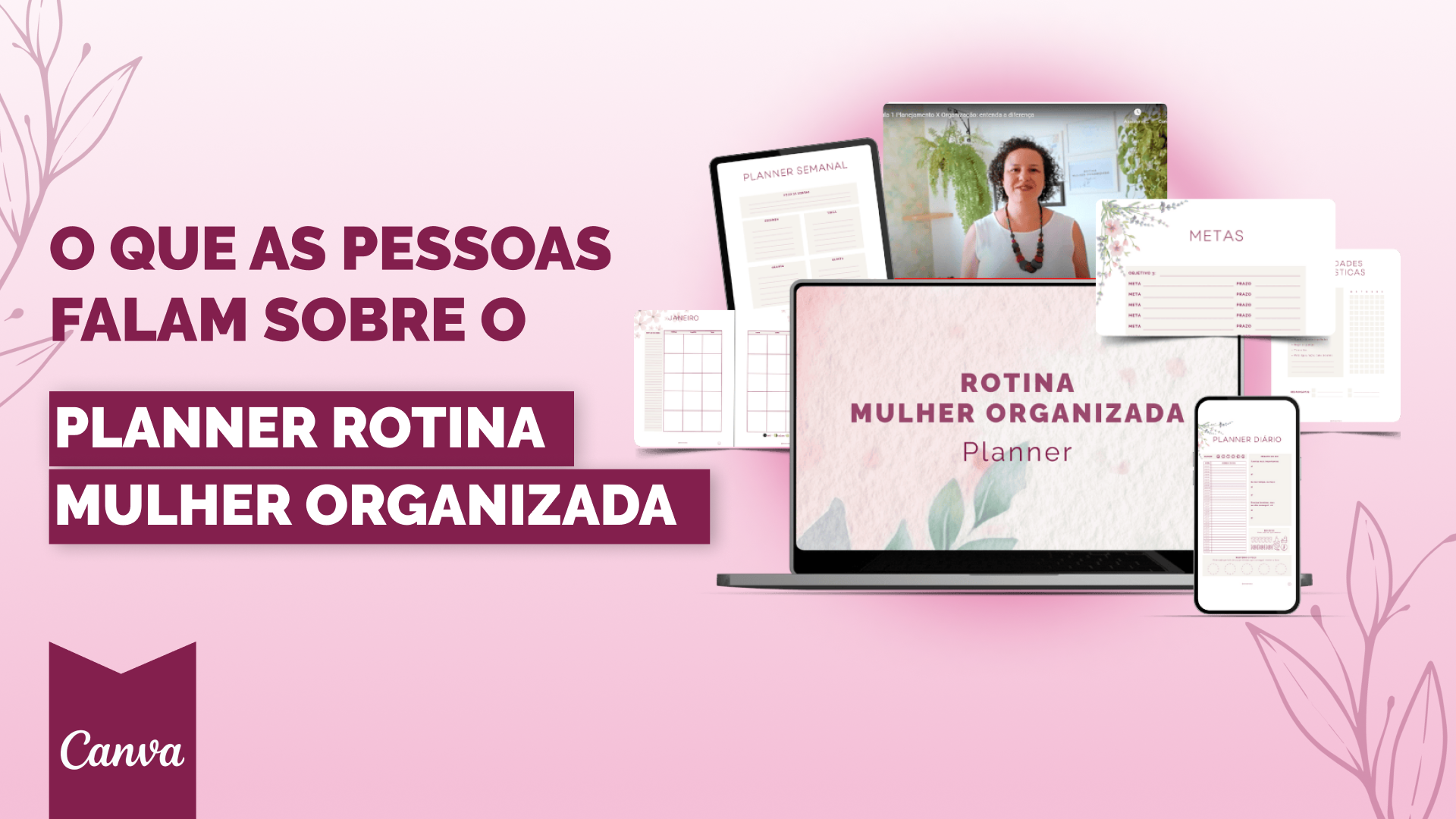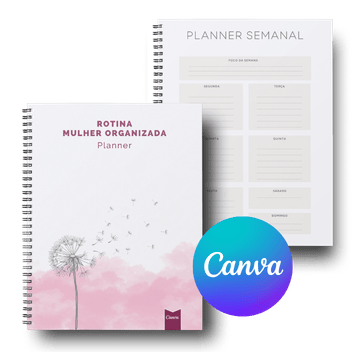 Planner Rotina Mulher Organizada é um planner digital que pode ser editado online na versão gratuita do Canva ou baixado em PDF para impressão ou edição online com as ferramentas do Adobe Reader